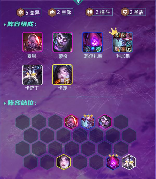 变异巨像在变异羁绊是超级肾上腺的时候,可称为版本T0阵容,3星大虫子直接能直接化身杀戮机器,强度高到爆炸,变异源计划也可考虑,强度又下降,其他变异不是很建议选择这套阵容。但如果开局又圣盾转或挑战魂可无视变异均可选择。