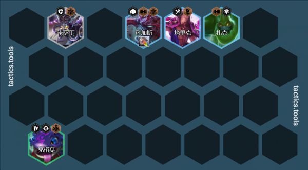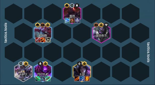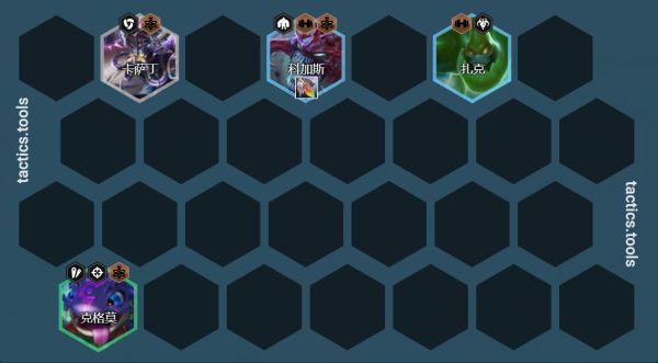 卡萨丁/机器人站位:左右吃钩子,中期无转职7人口机器人通常情况挂在3星玛尔扎哈旁边,钩一个过来挂毒秒掉,传染2个,后期换成蒙多或者卡莎或者斯维因提升上限