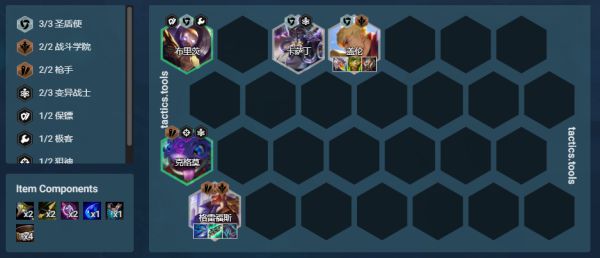 海克斯选择:圣盾(要拿转职+1+2没用,得让科加斯吃到这个加成才行)变异(建议拿+1/转职就好,后期上最好的4个变异即可)帝国(建议拿+1/转职的性价比最高,补个斯维因还有2黑法,拿+2也行少个2黑法,多腾出一个格子)护甲镀层(看到无脑拿,拿到就奠定前四基础)不稳定变异(无脑拿,合成加额外属性)DD街区(无脑拿,追3用)前进之路(只刷新在第一轮海克斯选择,可以7级一直D,5阶段自然上8补5变异或者3帝国)
