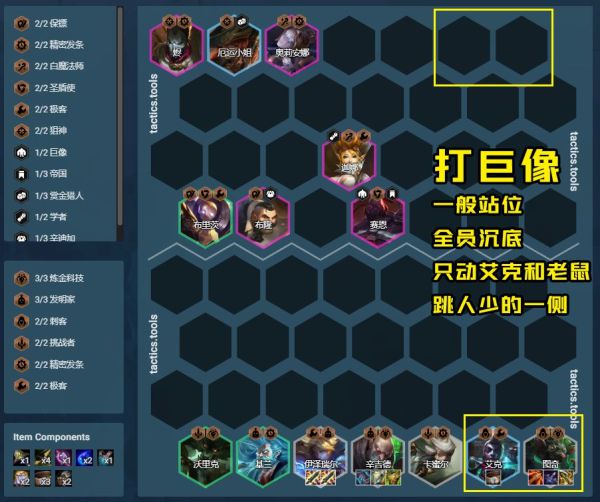 斗鱼恰饭、朱雀站位解析:分2种,全员沉底和辛吉德一个人前置单顶非巨像单位其他人沉底两种,取决于对面有没有很值得抛的大前排,比如薇古丝和三星波比这种适合炼金单顶,以下对常见的几套主流阵容一一分析站位