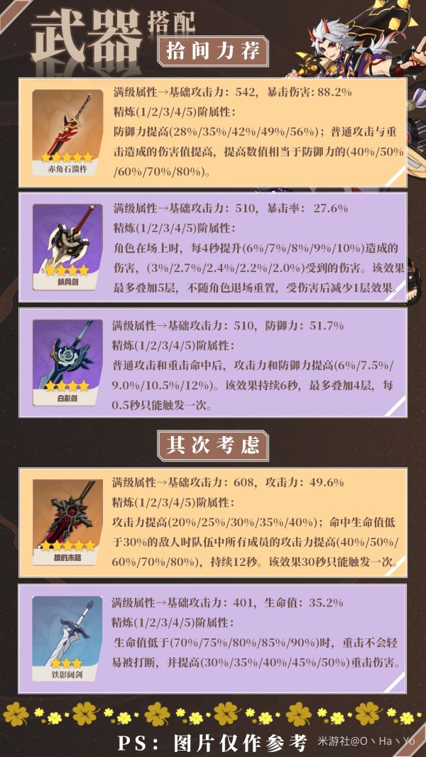 螭骨剑暴击+伤害加成,面板美观,稀缺的伤害加成也是除赤角以外最佳的适配武器。