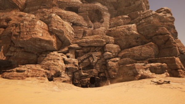 向河流的东北方向走,爬上悬崖,穿过两个岩层后即可抵达任务区域。这是片平坦开阔的沙漠地带,随后任务目标会更新。