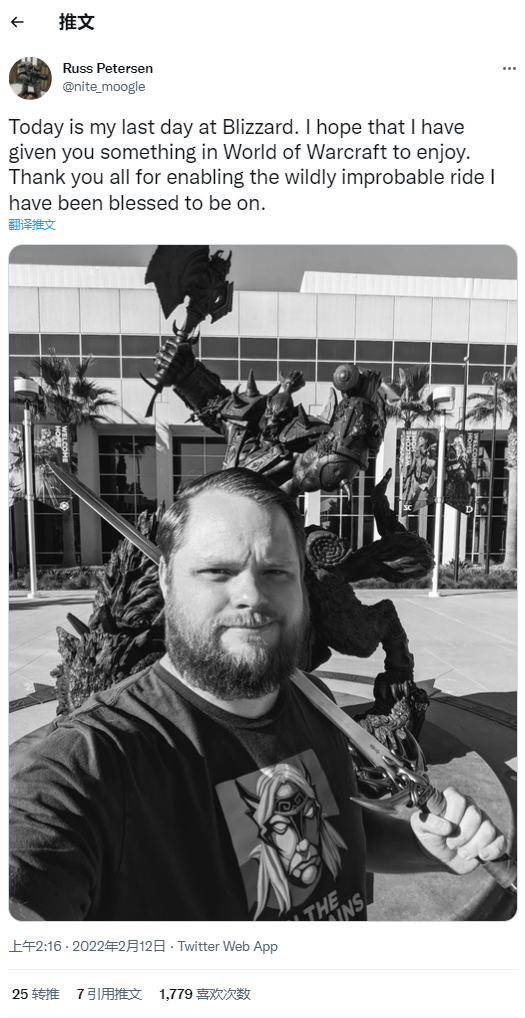 《魔兽世界》首席奖励设计师Russ Petersen离开暴雪,这是今年从暴雪离职的第四个高级开发人员了。